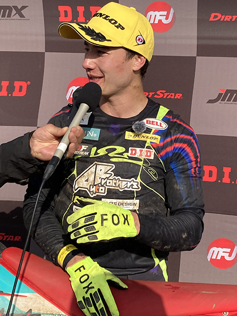 ニュージーランド選手権参戦中に怪我をされてしまった中島選手「(NZトレーニングの)終わり方はあんまり良くなかったです。怪我したのは右手の親指の先端の骨ですね。しっかり線がピッて入ってひびですかね。4戦あったんですけど、3戦目でやっちゃいました。1週間後は4戦目で、ちょっと出たいなと思って走ってみたんですけど、結構痛くて。下田丈、すごいなと思いましたこれでスーパークロス走ってるので半端ないなと」NZトレーニングや選手権参戦の感想を伺うと「目標にしてた優勝はできなかったけど最高位で2位。スピード的には可能性も感じられたというか自信になったところも結構ありましたね。あの時があれで結構なんかこれいけるんじゃね?って思い始めちゃってその後のレースで怪我した感じです。浮かれてました(苦笑)」「今まではトレーニングがメインでしたけど初めて海外でレース参戦したんですけど全てが違う環境で自分のベストを尽くすっていうところが難しかったです。それでもこれからのことを考えるとめちゃくちゃいい経験になりましたね。それこそ直近で行ったらNationsとかの間に経験しておいてよかったっておそらくなりそうな」と、これからの海外でのレースに対して良い経験ができたと語られました。ディフェンディングチャンピオンという立場について伺うと「追われる立場になったことについては、意外と始まりそうになって初めて、なんか、一番なんだみたいな。ふと気がついたら、俺一番だったんだみたいな。チャンピオンか…みたいな。ジャージとかバイクとか完成させてやっとなりましたね(笑)」「そこが今年もう一回チャンピオンを獲れるか獲れないかの大事なところかなって思うんで。でもあんまり気負いすぎずってところが今年の難しいところかなと思ってます」「今シーズンもやっぱり自分自身のスピードを上げ続けていきたいので。そこはやっぱり全戦成長っていうところはしていきたいなと思っています。」ライバルとして意識するのは誰ですか?という質問には「意識するのはちょっとあの…ジェイを意識するかなと思って。やっぱり、上を見ようと思って日本でも。同じクラスの誰かとチャンピオン争いとかそういうことではなくて、ジェイの走りを…そうですね、何秒差とか。」チャンピオンを獲った頃の勝谷武史選手がよく言ってましたよ450よりタイム速かった、とか。「いやー、それやりたいですね。450のタイムより良かったら僕は絶対言っちゃいますね(笑)」ブライアン・シュー選手に対しては「海外を意識している自分にとっては彼の参戦はめちゃくちゃ嬉しいっす」とおっしゃっていました。