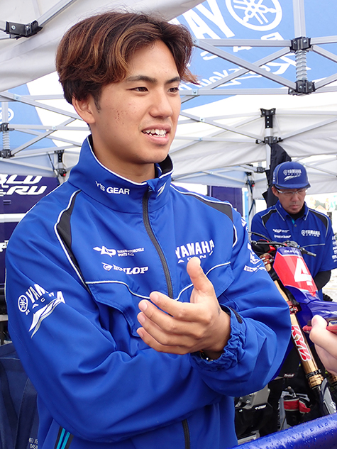 開幕前、SUGOのプログラム用にお話をうかがった佐々木選手。初インタビューでいろいろ伺いました。「IAは今年で8年目です」中堅ってカンジですよね?「そうですね、だいぶ。だいぶそうです(笑)でも、去年初めて表彰台だったんで、長かったです。4位はあったんですけど、表彰台はなかったんですよ。SUGOで初めて4位が入ったのが、一昨年。表彰台に乗ったことで目線が変わりましたね」今シーズンは更に上を、できたら地元 SUGOで表彰台に乗りたいといったおっしゃっていたのですが「シーズン前半1番印象に残っているのは地元の菅生大会です。両ヒートビックリするくらいスタート遅れてしまってでも1番冷静に走れたレースだったのであの日1番人を抜いたんじゃないかな?ってくらい追い上げられました(笑)」と、前を走れる場面もあったものの今一つ結果に繋がらず残念。前半戦で1番嬉しかったのは「ファンの皆さんが販売したTシャツを着用して会場に来てくれてやっぱり地元最高って思いました!GP大会も販売予定です!」「逆に悔しかったのは第3戦のオフビです。スタートも決まったのに全く路面に対応出来なくて3ヒートもあるのに立て直すことができなかったことが悔しかったです。後半戦にむけての課題は小さなミスを減らす事。安定したライディングを身につけます!」とのこと。夏のインターバルの予定も伺ったところ「7月27日に地元宮城の涌谷オフロードパークと言うコースでライディングスクールからミニレースなどみんなでワイワイ楽しめるイベントを開催します!キッズ初心者もレース出てる人も参加可能になってます!エントリーはSNSメッセージで受付しています!!皆さんのお越しお待ちしています」とのことでした。ぜひともご参加ください。
